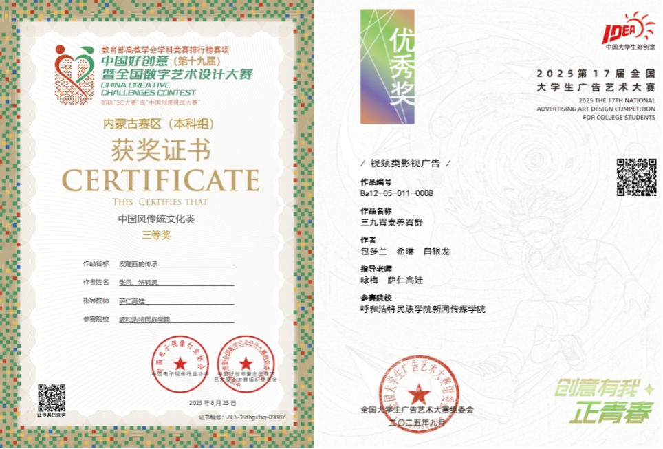 近日,我校新闻传媒学院学生在“中国大学生好创意”第17届全国大学生广告艺术大赛中取得佳绩。2023级新闻学班包多兰团队斩获全国优秀奖;王学敏团队《三九胃泰,专治各种不服!》与包多兰团队《三九胃泰养胃舒》双双荣获内蒙古赛区一等奖,樊欣团队《我们这一“袋”》获三等奖,霍启光、闫欣等十名同学获自治区优秀奖。此前,2022级新闻学班张丹团队也在第十九届全国数字艺术设计大赛中夺得内蒙古赛区三等奖。