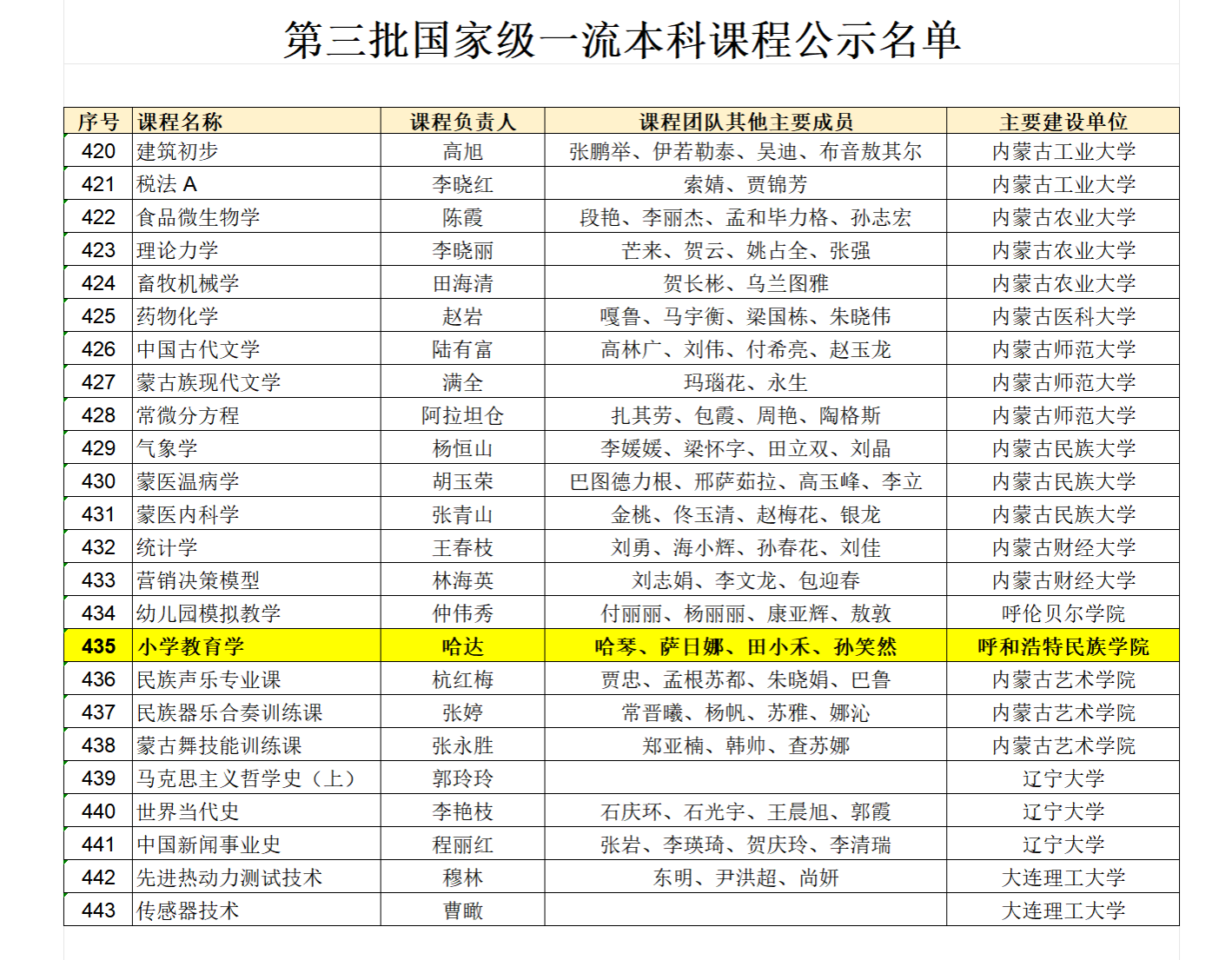建设国家级一流课程《小学教育学》及自治区级一流课程《小学课程与教学论》《教育学原理》《自然科学导论》《学前教育学》等5门精品课程。形成基础理论+实践能力+创新素养的课程群体系,为边疆地区基础教育人才培养提供核心支撑。