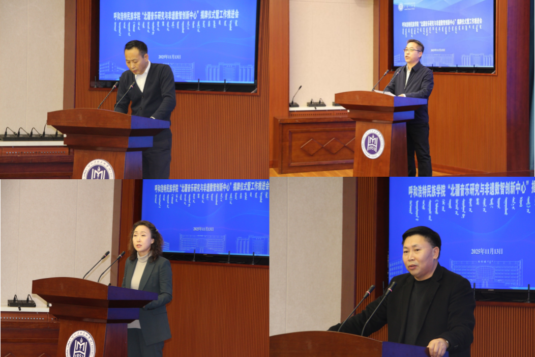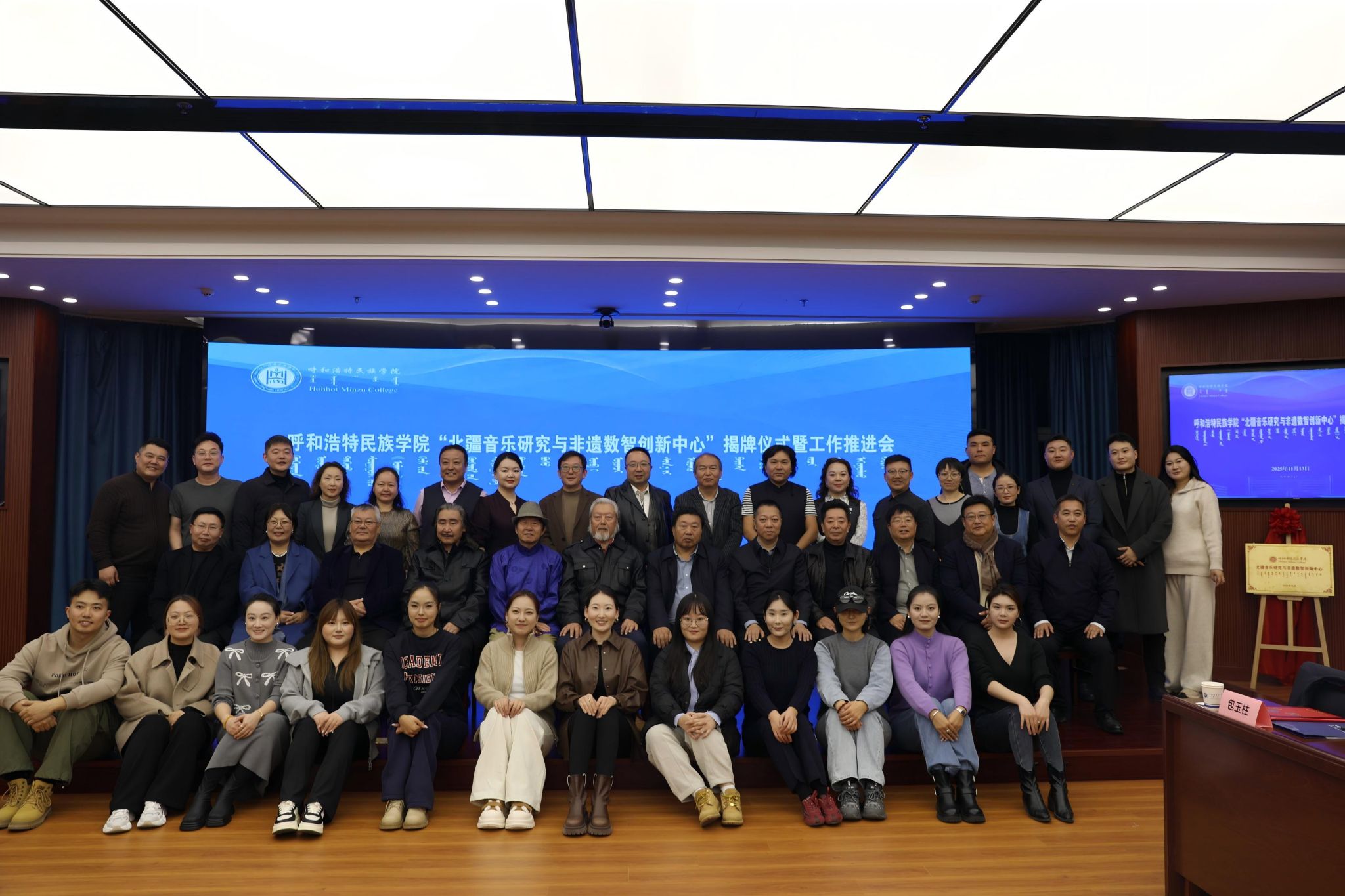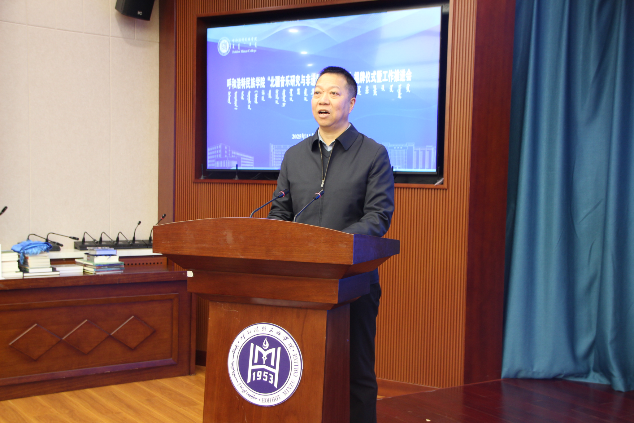 11月13日下午,我校“北疆音乐研究与非遗数智创新中心”揭牌仪式及工作推进会在综合楼12楼会议室举行。校党委委员、副校长双虎出席并讲话,内蒙古自治区人大教科文卫委员会副主任委员吴海龙、内蒙古师范大学音乐学院杨玉成教授、江西科技师范大学音乐学院哈斯巴特尔教授等区内外专家学者以及中国音乐学院、内蒙古师范大学、内蒙古艺术学院,我校科研处、音乐与舞蹈学院相关负责人及师生代表参加。
