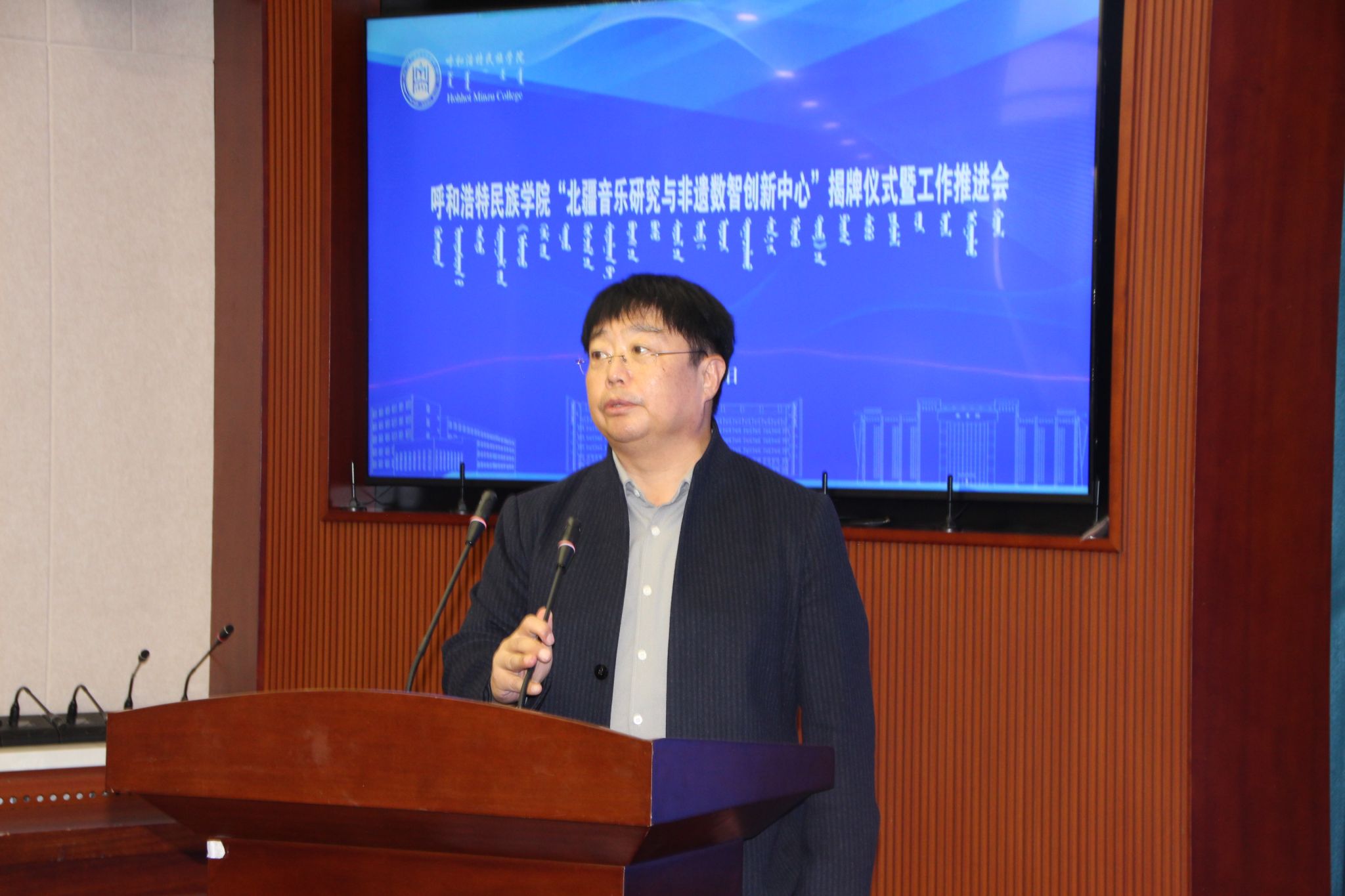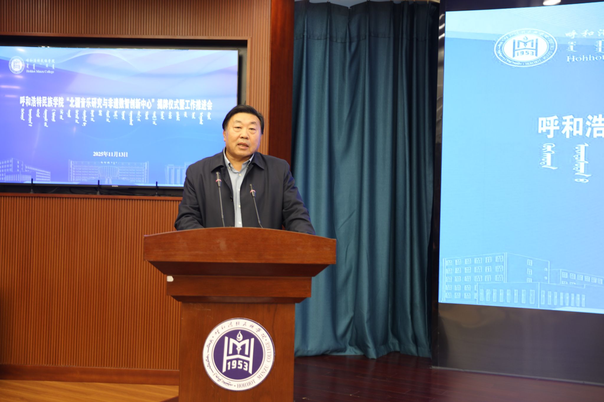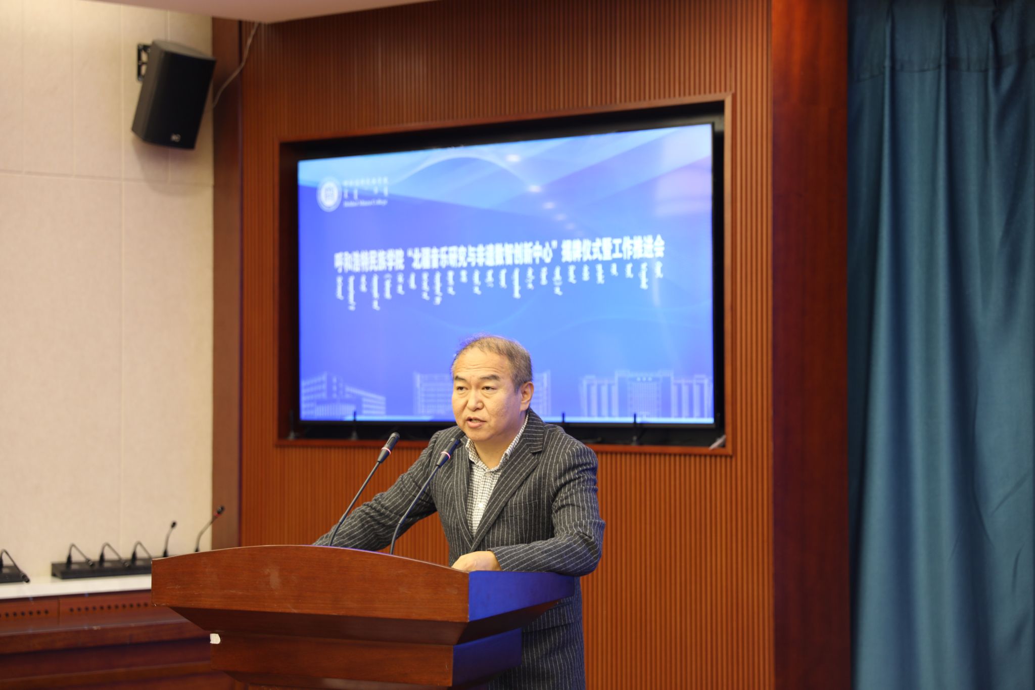 11月13日下午,我校“北疆音乐研究与非遗数智创新中心”揭牌仪式及工作推进会在综合楼12楼会议室举行。校党委委员、副校长双虎出席并讲话,内蒙古自治区人大教科文卫委员会副主任委员吴海龙、内蒙古师范大学音乐学院杨玉成教授、江西科技师范大学音乐学院哈斯巴特尔教授等区内外专家学者以及中国音乐学院、内蒙古师范大学、内蒙古艺术学院,我校科研处、音乐与舞蹈学院相关负责人及师生代表参加。