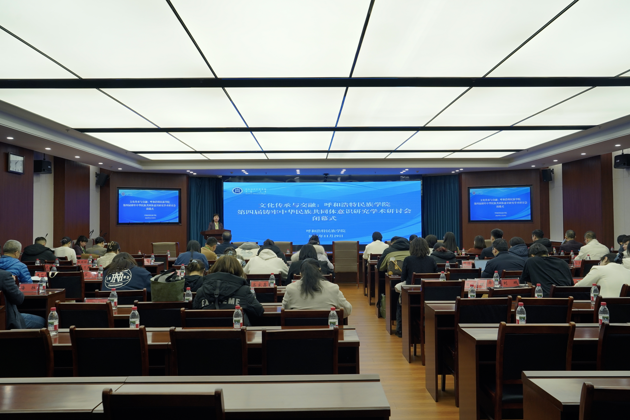 闭幕式由我校新闻传媒学院党总支书记苏伦高娃主持。学校铸牢中华民族共同体意识研究基地常务副主任、民族学学院院长青斯琴作总结发言。内蒙古科技大学马克思主义学院杨丽静教授、呼和浩特民族学院乌恩宝力格副教授、沈阳建筑大学张雨欣副教授、内蒙古自治区社会科学院王海荣研究员分别代表四个分论坛在闭幕式上交流发言。