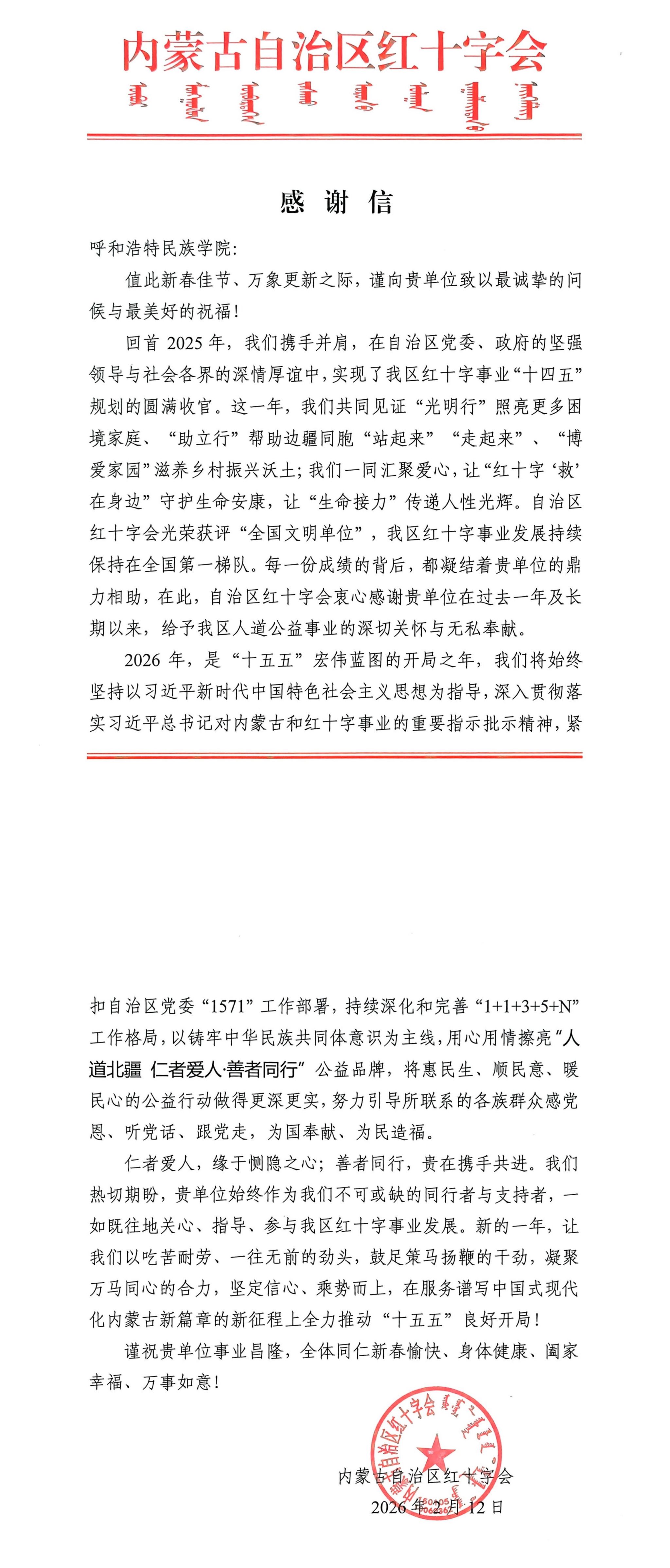 近日,内蒙古自治区红十字会向我校发来感谢信,向全体干部职工致以新年问候,并对我校长期以来给予内蒙古自治区红十字事业的关心与支持表示衷心感谢。信中指出,学校的支持是内蒙古自治区红十字会2025年度各项工作取得显著成效的重要助力。