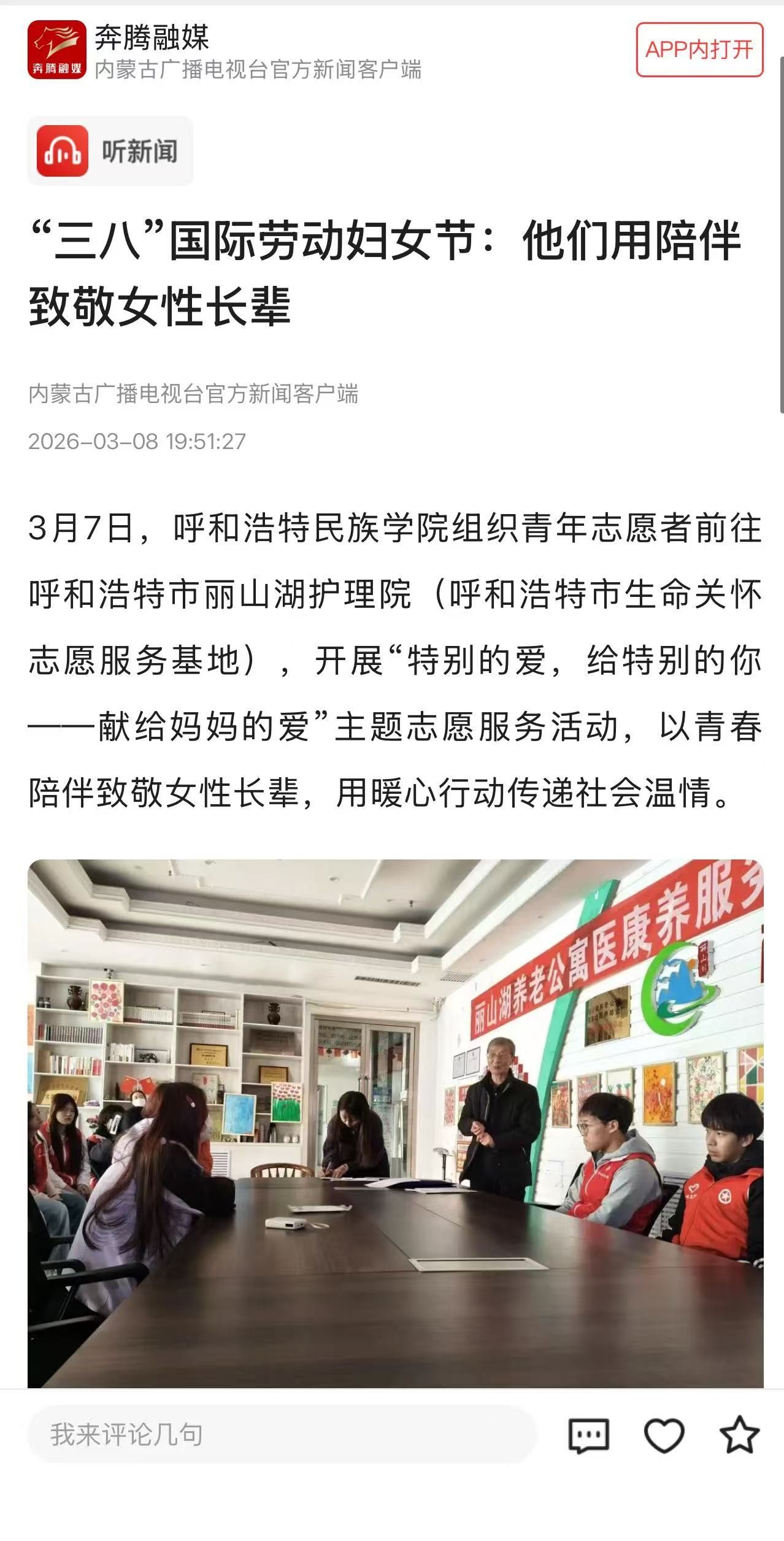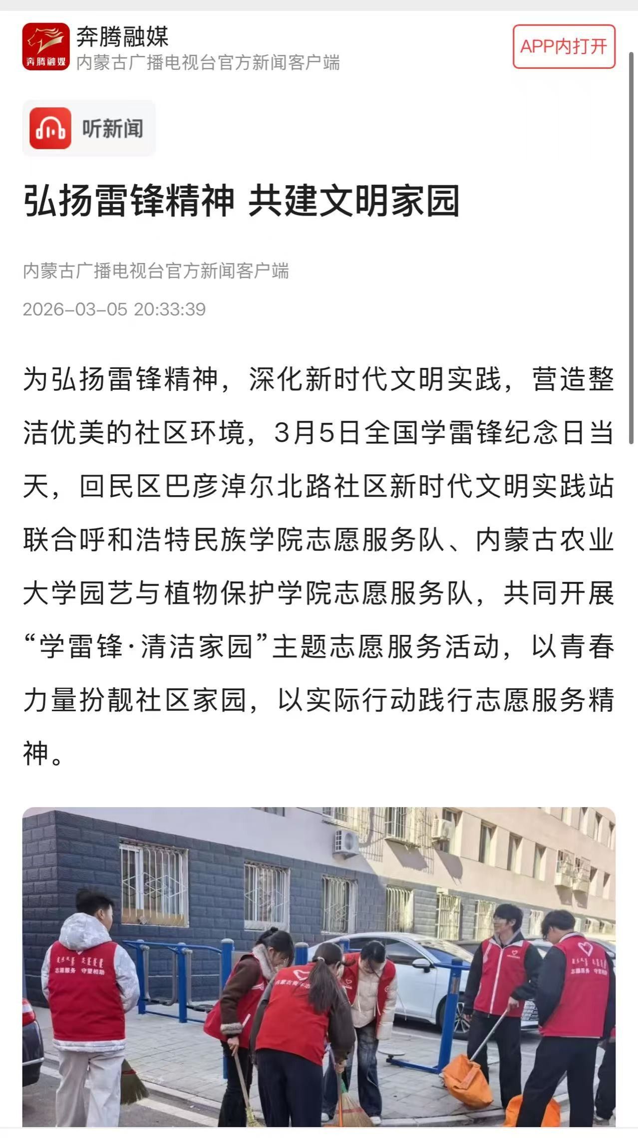 志愿者先后开展“学雷锋・清洁家园”社区环境整治、“三八”国际劳动妇女节:“用陪伴致敬女性长辈敬老助老志愿服务,以实际行动践行奉献精神。我校4 名志愿者应邀参加内蒙古电台 “我爱公益” 节目直播采访,相关活动获《奔腾融媒》内蒙古广播电视台官方新闻客户端专题报道。
