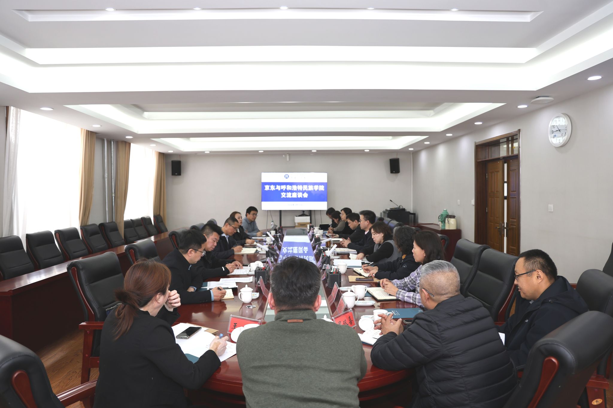 3 月 13 日上午,京东与呼和浩特民族学院交流座谈会在办公楼二楼会议室举行。校党委委员、副校长额尔敦布和出席会议,京东科技集团合作高级总监徐永东、方案高级经理徐纪成,京东科技集团内蒙核心生态伙伴刘泽、张小乐、曾志勇一行参会,校企双方围绕人工智能赋能教育、产教协同育人、平台共建与资源共享等议题开展深入交流。