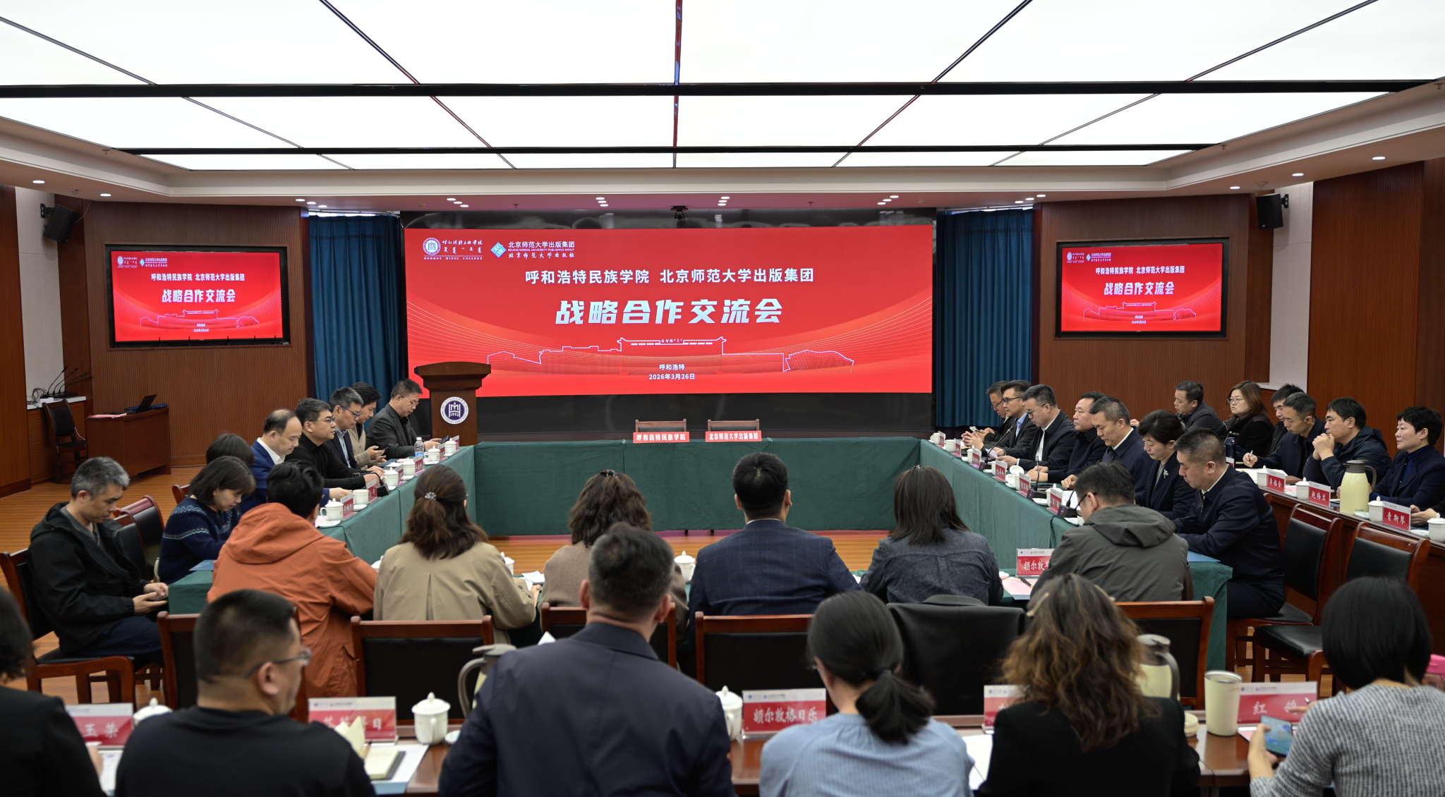 3月26日,学校与北京师范大学出版集团战略合作交流会议在综合楼12楼会议室召开。自治区教育厅党组成员杨玉春,自治区教育厅教材与语言文字应用管理处处长、一级调研员包革命,北京师范大学出版集团总编辑饶涛以及我校党委副书记、校长王敏,党委委员、副校长额尔敦布和出席会议。会议由额尔敦布和主持。
