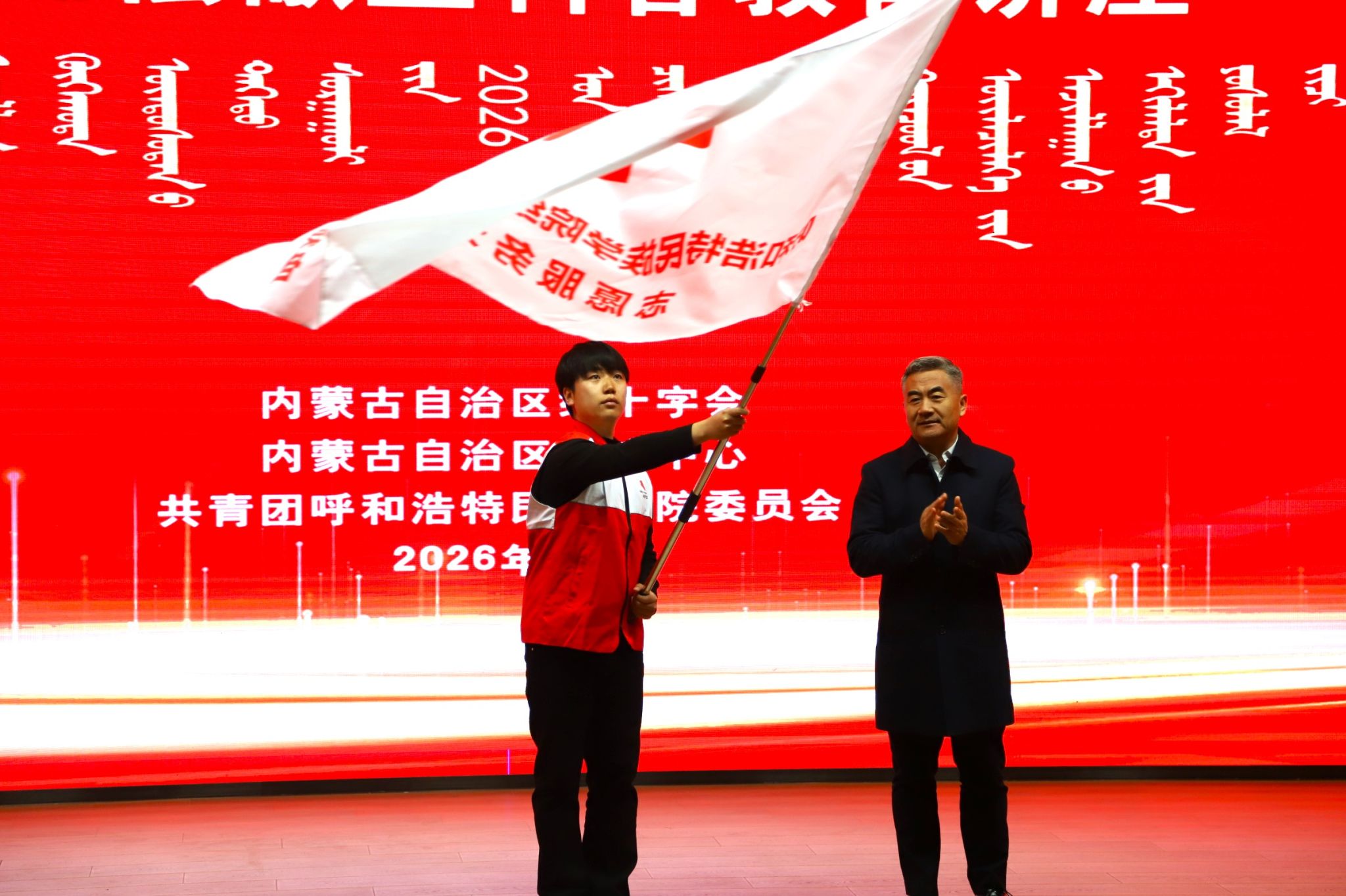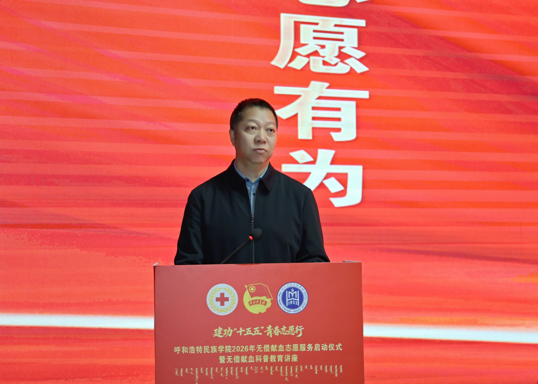 为大力弘扬“奉献、友爱、互助、进步”的志愿精神,推动无偿献血与造血干细胞捐献志愿服务工作深入开展,3月26日,由自治区红十字会、自治区血液中心、校团委联合主办的建功“十五五”青春志愿行——呼和浩特民族学院2026年无偿献血志愿服务启动仪式暨无偿献血科普教育讲座在我校铸牢教育馆二楼报告厅举行。自治区红十字会党组成员、副会长陈立本,校党委委员、副校长双虎,自治区红十字会捐献服务中心主任萨茹拉,自治区血液中心副主任包春荣出席活动。