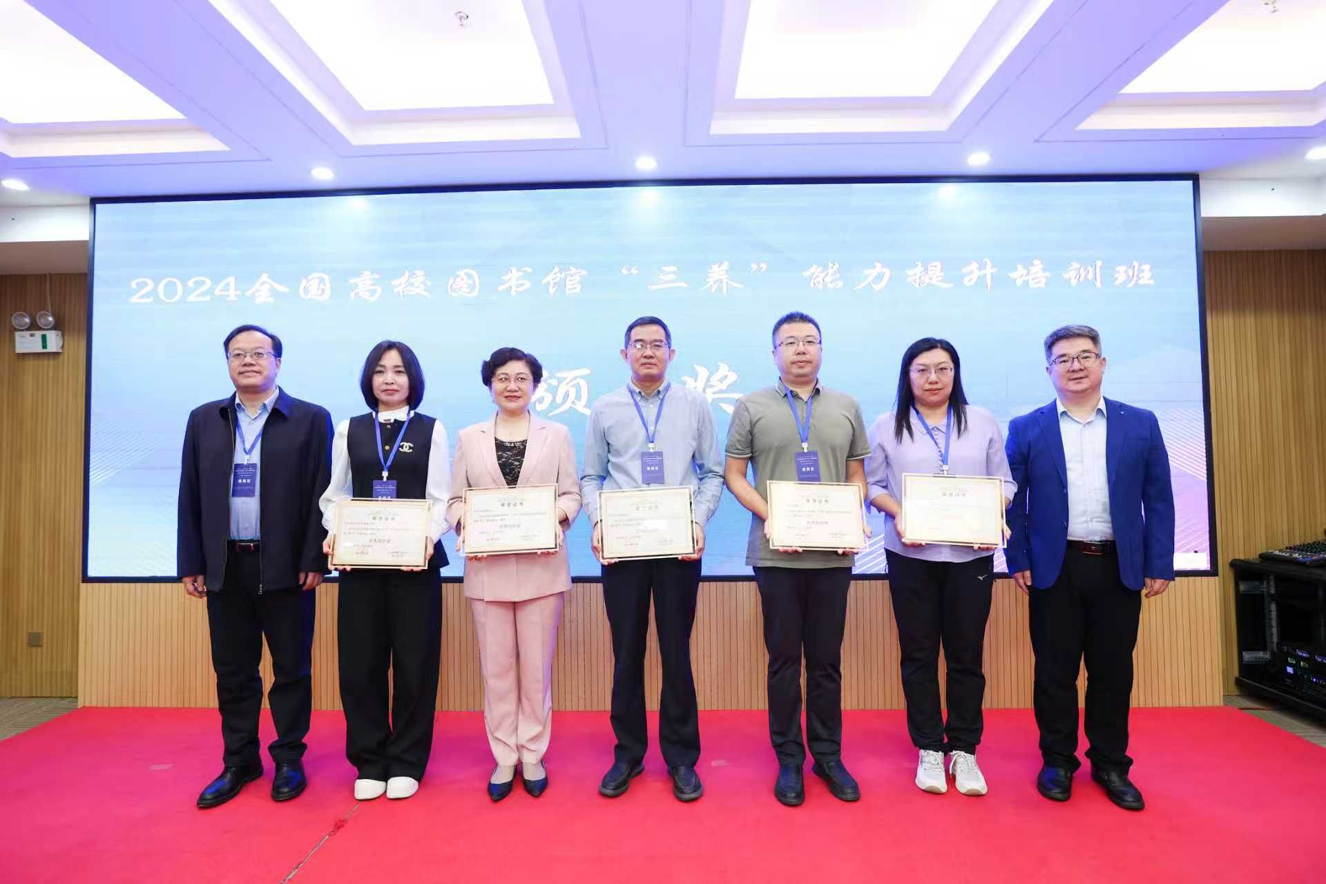 仪式上,主办方为2024全国高校图书馆“三养”能力提升培训班获奖单位颁发了获奖证书。2024年我校图书馆积极组织馆员参加以强化馆员信息素养、学术素养与文化素养为主旨的全国高校图书馆“三养”能力提升培训班,参与人数和完成率均位居自治区前列,我校图书馆凭借参与培训的积极态度和出色的组织能力荣获“优秀组织奖”。图书馆参考咨询部主任薛芳作为优秀组织单位获奖代表发表了获奖感言,分享了培训在提升馆员信息、学术与文化素养方面的显著成效,并对2025年培训的前沿性和创新性表达了热切期待。