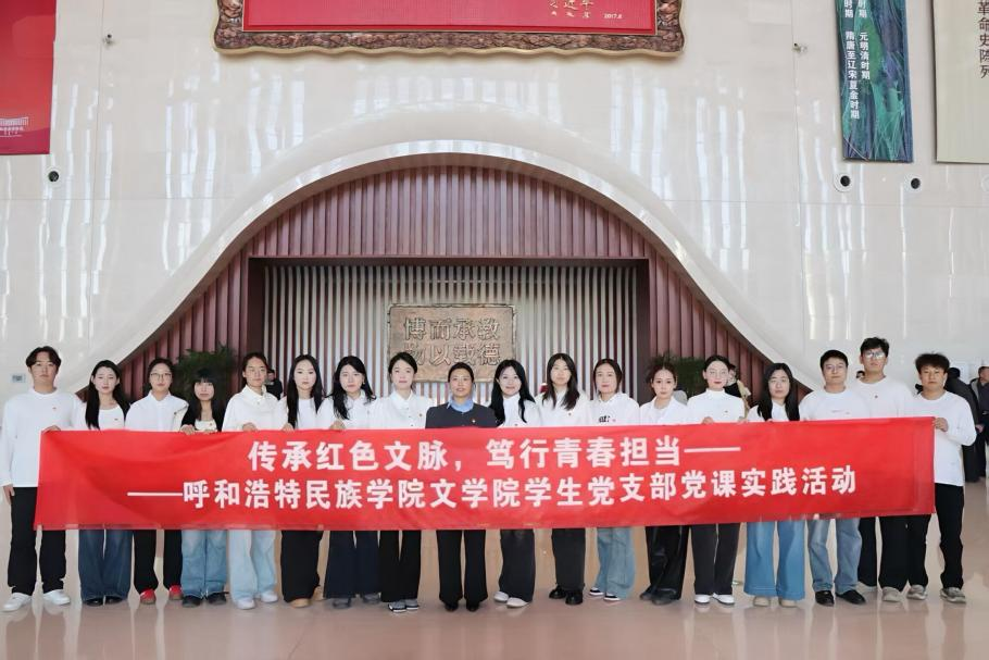 为全面贯彻党的二十届四中全会精神,坚持以铸牢中华民族共同体意识工作主线,11月14日,文学院学生党支部以“传承红色文脉 笃行青春担当”为主题开展第34期党课实践活动。在学生党支部书记刘晓老师带领下,30余名学生党员、入党积极分子走进内蒙古博物院,沉浸式接受红色教育与文化的熏陶。