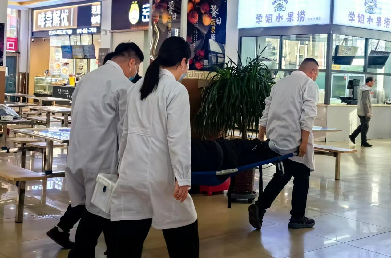 演练启动后,食堂安全管理员第一时间停售涉事食品并按流程上报,同时引导疑似不适学生至临时观察区。校医务所人员迅速抵达现场,完成对患者的问询、症状记录及初步医疗处置,随后使用担架将其转运至定点医院。同步,食堂对涉事窗口实施封锁管控,设置警戒区域,并立即启动同批次就餐人员追踪溯源工作,对涉事食品样本进行规范封存。整场演练历时30分钟,各环节衔接顺畅,响应迅速,有效验证了应急预案的可行性与时效性。