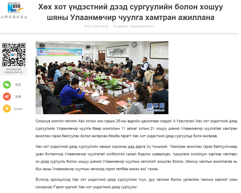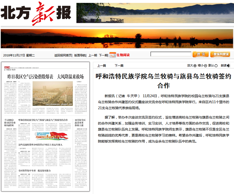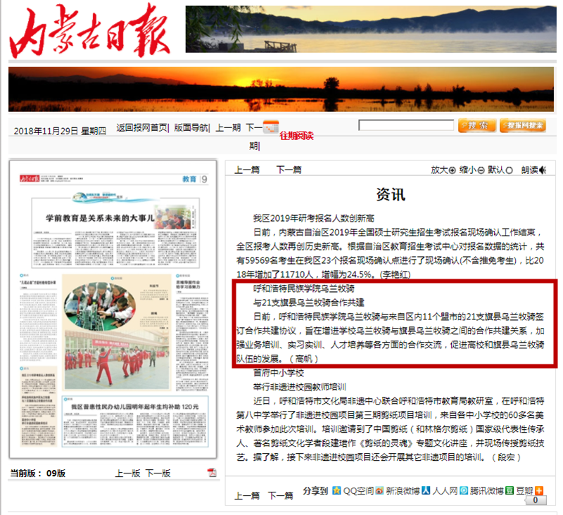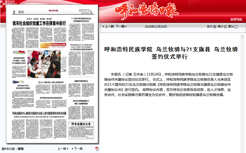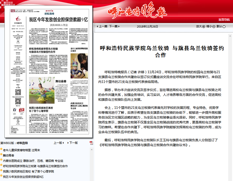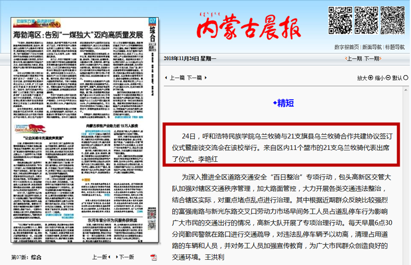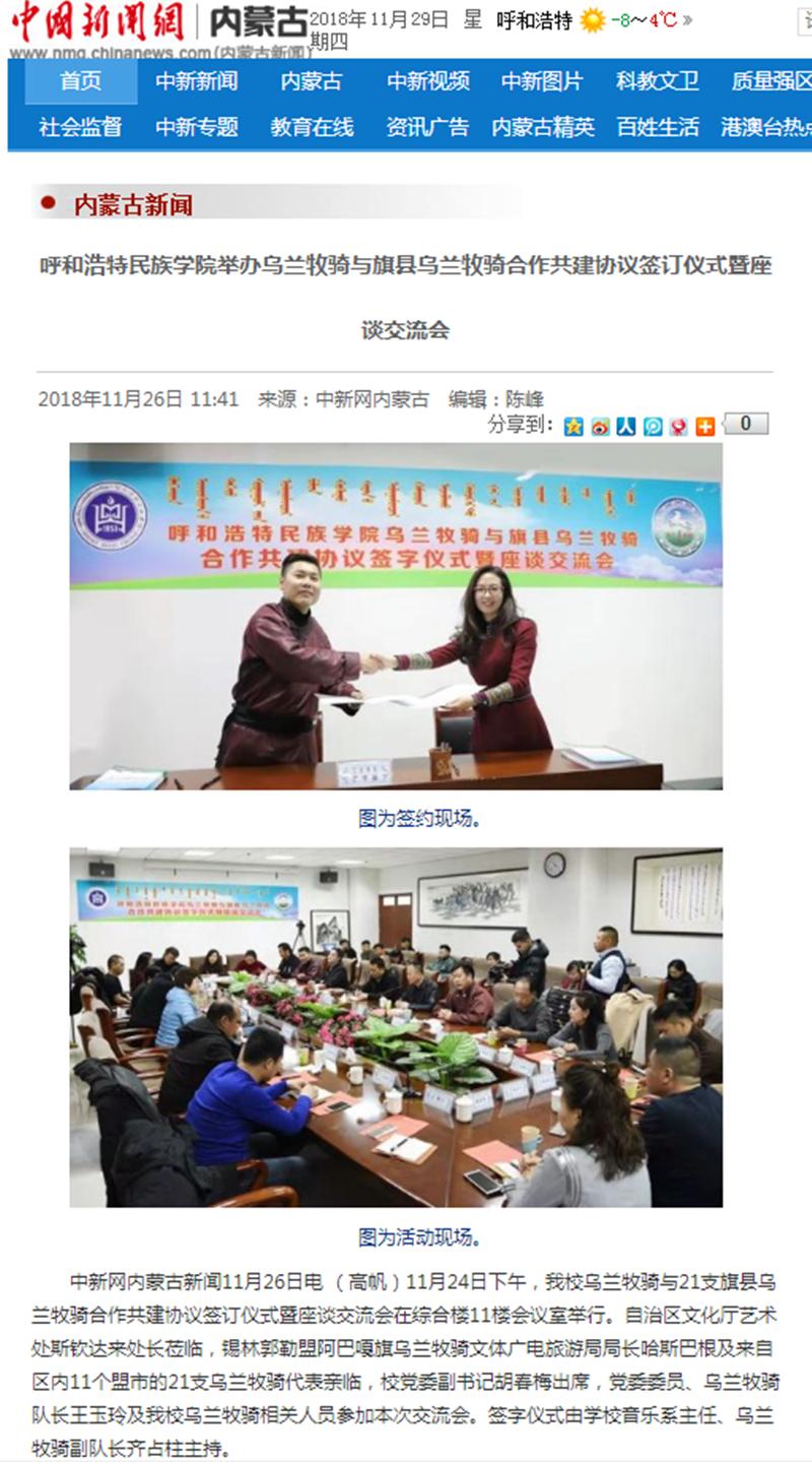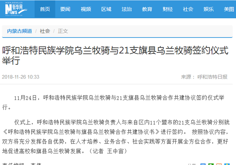 11月24日,我校乌兰牧骑与21家旗县乌兰牧骑举行举行签字仪式,并就下一步合作共建进行交流座谈。连日来,内蒙古广播电视台、呼和浩特广播电视台、《内蒙古日报》(蒙汉文版)、《北方新报》、《呼和浩特日报》、《呼和浩特晚报》、新华网、中国新闻网、呼和浩特新闻网、呼和浩特广播电台等12家自治区主流媒体对活动进行了报道,内蒙古新闻网、新浪网等8家媒体进行了转载报道。通过媒体的广泛关注,进一步展示我校乌兰牧骑队伍的风采,提高了我校乌兰牧骑的影响力。