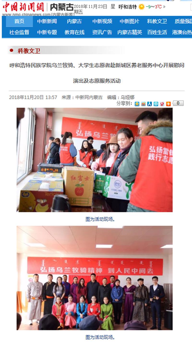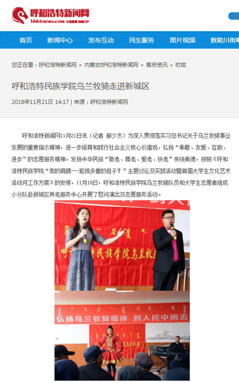 近日,中国新闻网、呼和浩特新闻网、大学生手机报先后报道我校乌兰牧骑队员和大学生志愿者组成小分队赴新城区养老服务中心开展的慰问演出及志愿服务活动。我校乌兰牧骑自成立以来,陆续开展了7场演出活动,得到了区内外媒体的广泛关注,这不仅是我校乌兰牧骑的光荣,也提高了学校的美誉度。