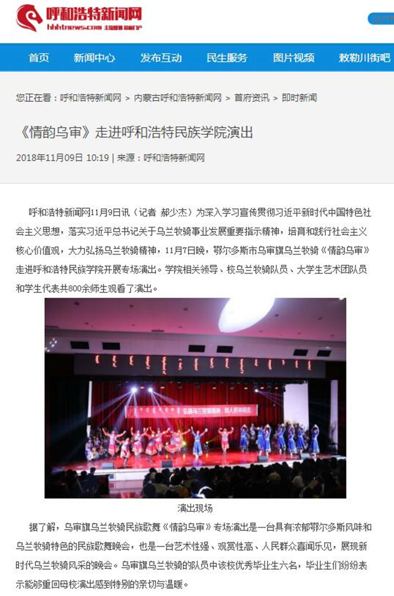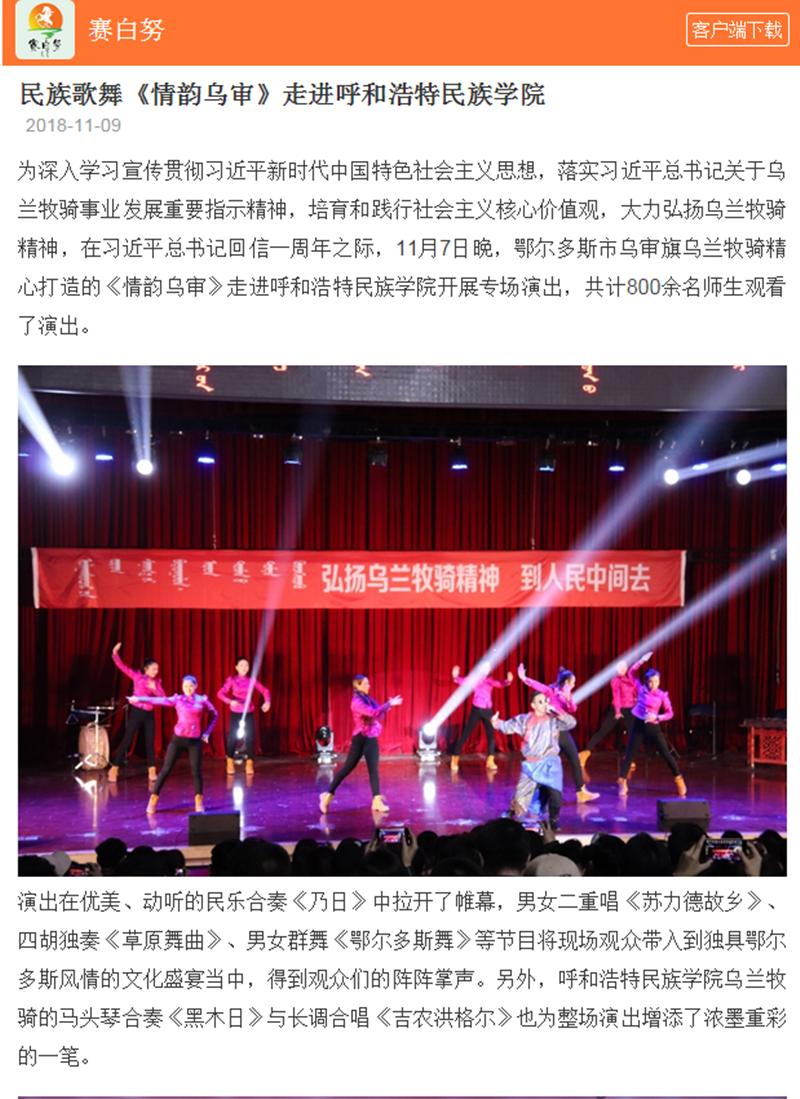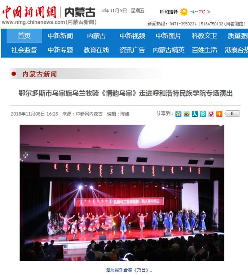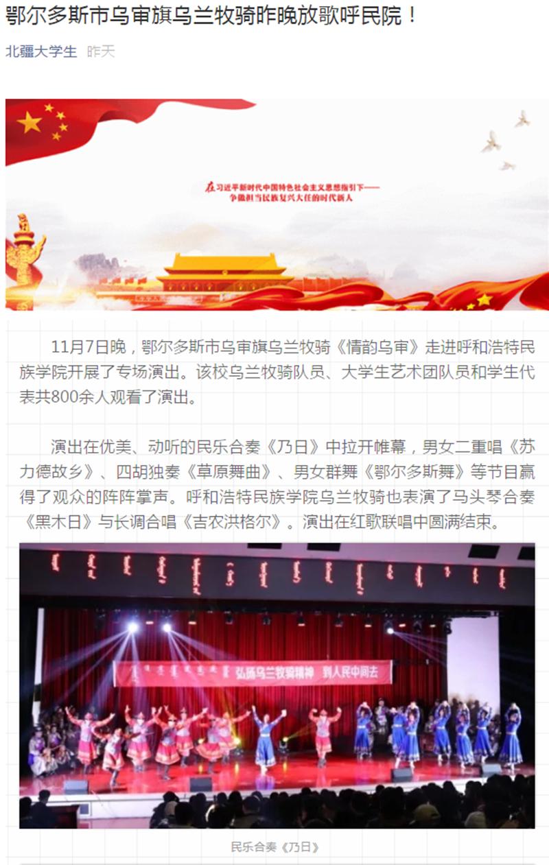 11月7日,鄂尔多斯市乌审旗乌兰牧骑《情韵乌审》来我校开展专场演出。本场演出体现出浓郁的鄂尔多斯风情和鲜明的乌兰牧骑特色,具有艺术性和观赏性,受到现场师生的喜爱。 中国新闻网、呼和浩特新闻网、北疆大学生、内蒙古旅游融媒体对活动进行了专题报道。