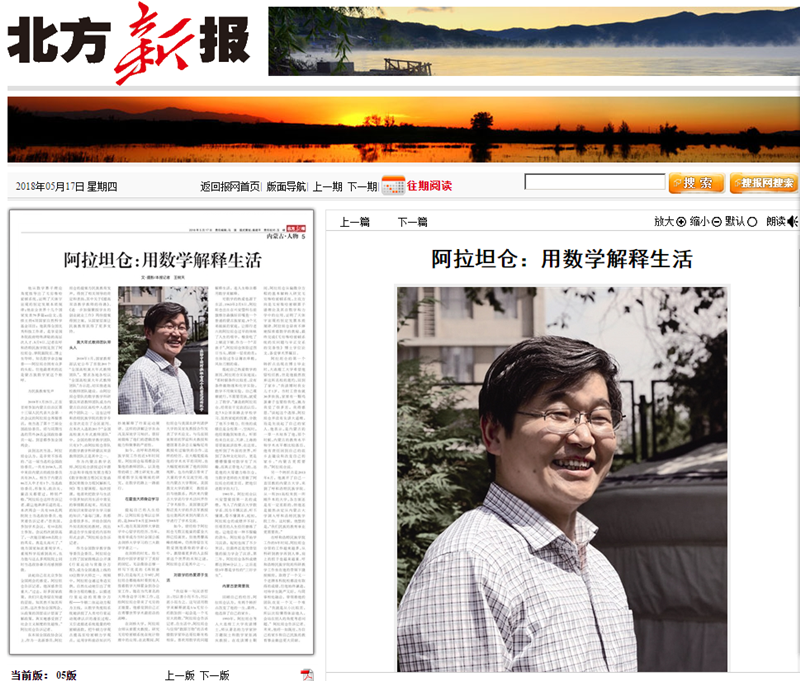 2018年5月17日,《北方新报》刊发题为《阿拉坦仓:用数学解释生活》的整版报道。该文讲述了阿拉坦仓副院长在霍金身边的求学经历,介绍了他作为全国政协委员和黄大年式教师团队带头人,对发展民族教育和数学研究事业所做出的努力,赞誉了阿副院长心怀感恩、回报家乡之情。
