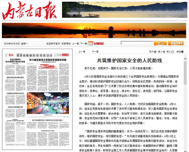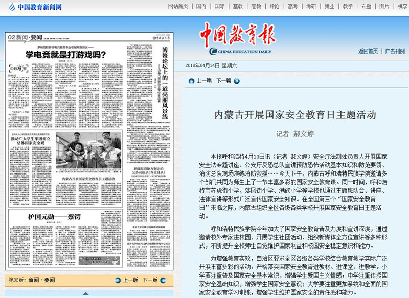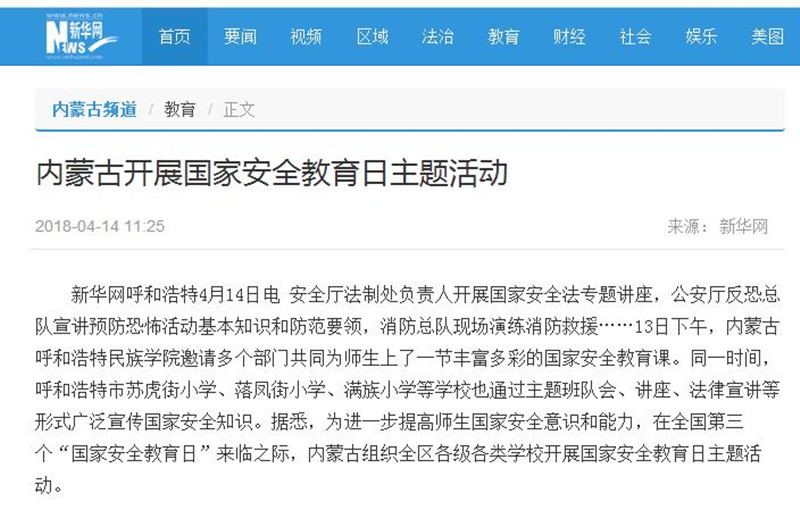 4月15日,我校联合自治区安全厅、教育厅、反恐总队等相关单位在校园内开展了“4.15”全民国家安全教育日、创建平安校园及综合治理系列活动。在此次活动中,我校作为教育部思政司向国家新闻媒体推荐的四所高校之一,因宣传工作特色鲜明、活动形式丰富多样、活动参与度高而受到媒体的广泛关注。 新华网、中国教育报、内蒙古电视台、《内蒙古日报》、中国教育新闻网等媒体对我校开展的国家安全日活动进行了报道,正北方新闻网、新浪网等媒体进行了转载报道。