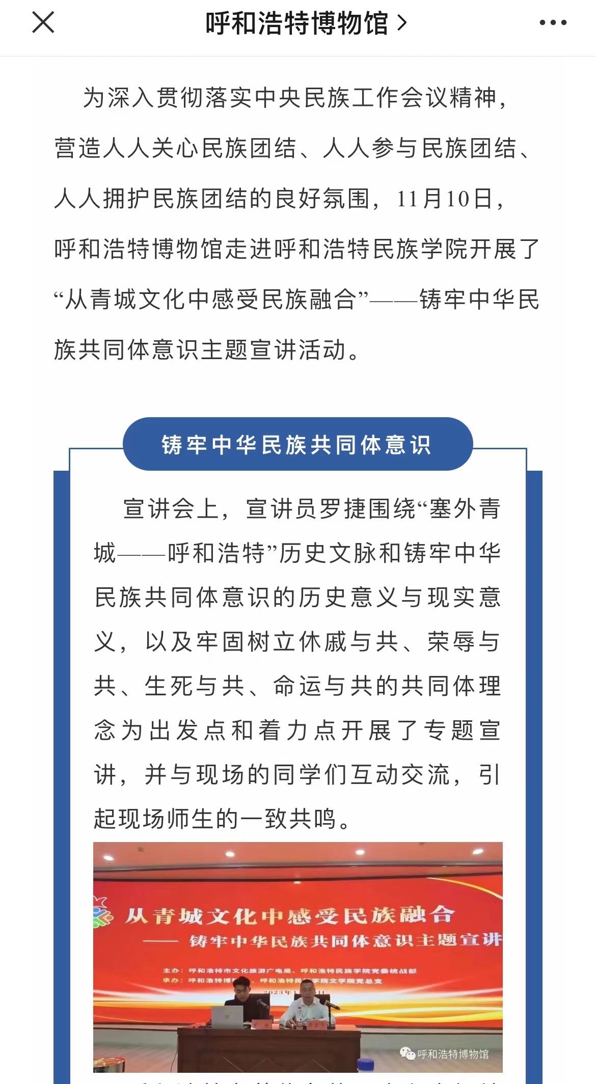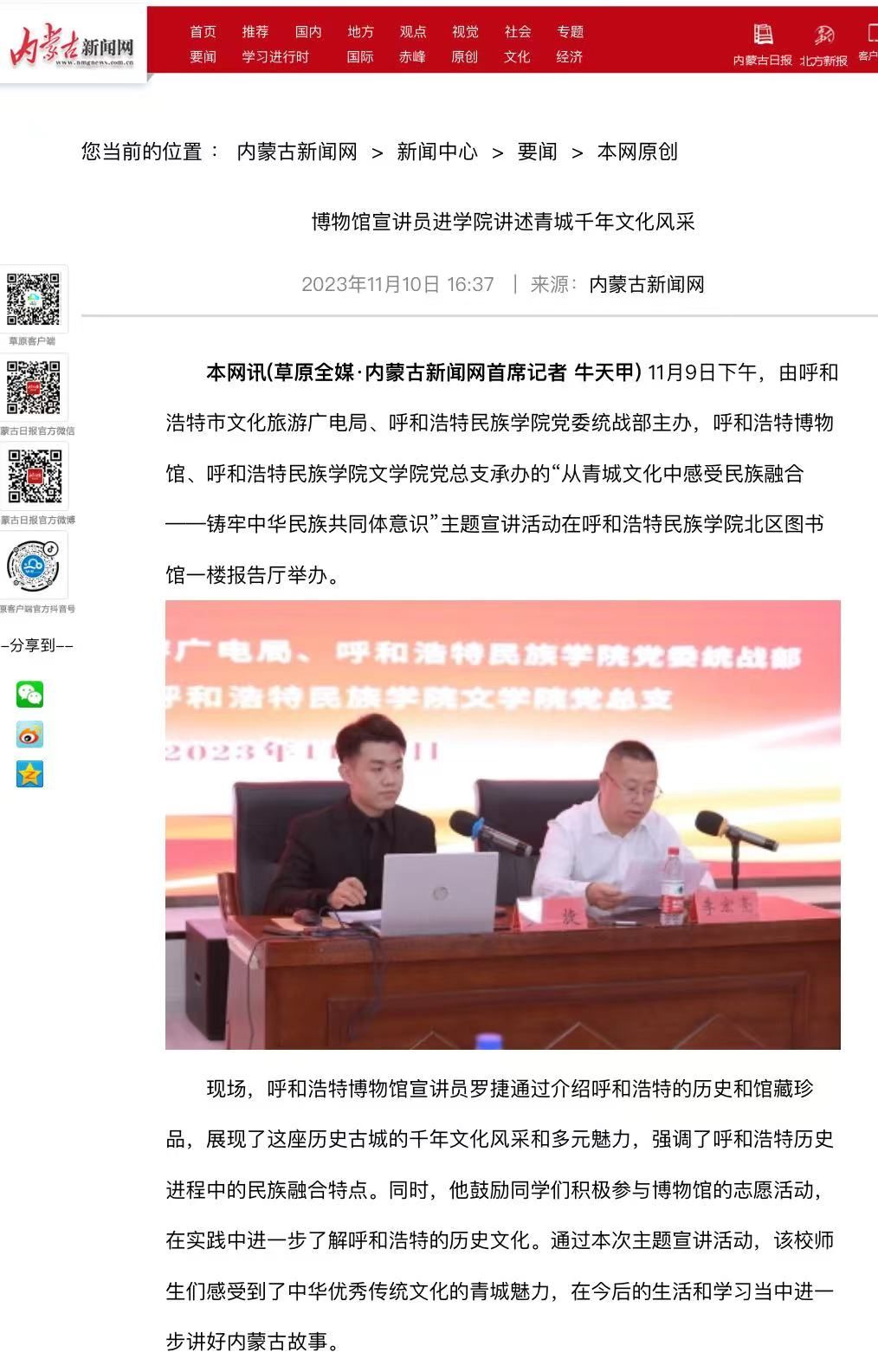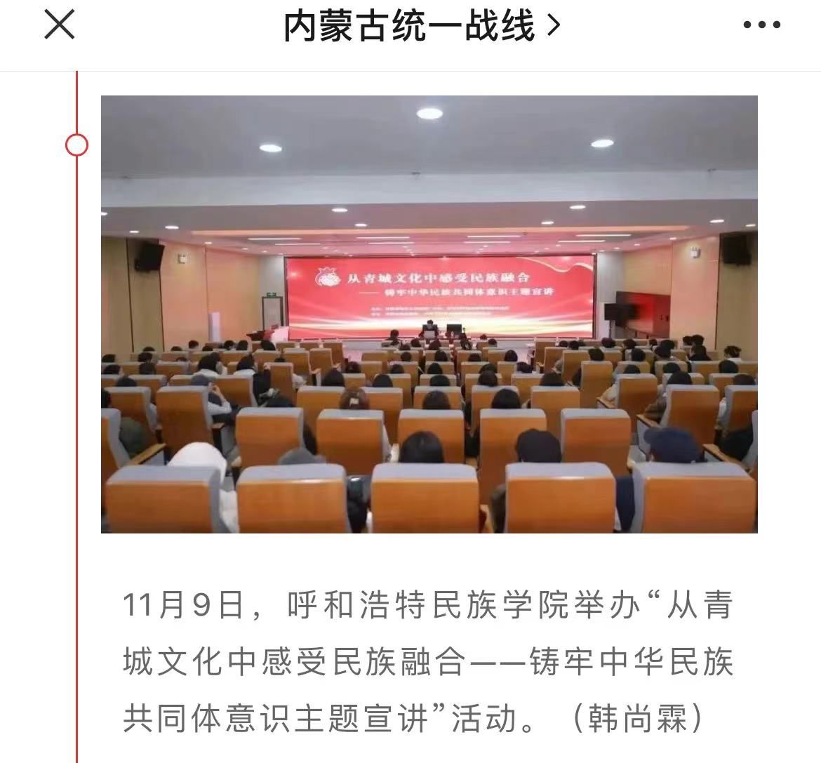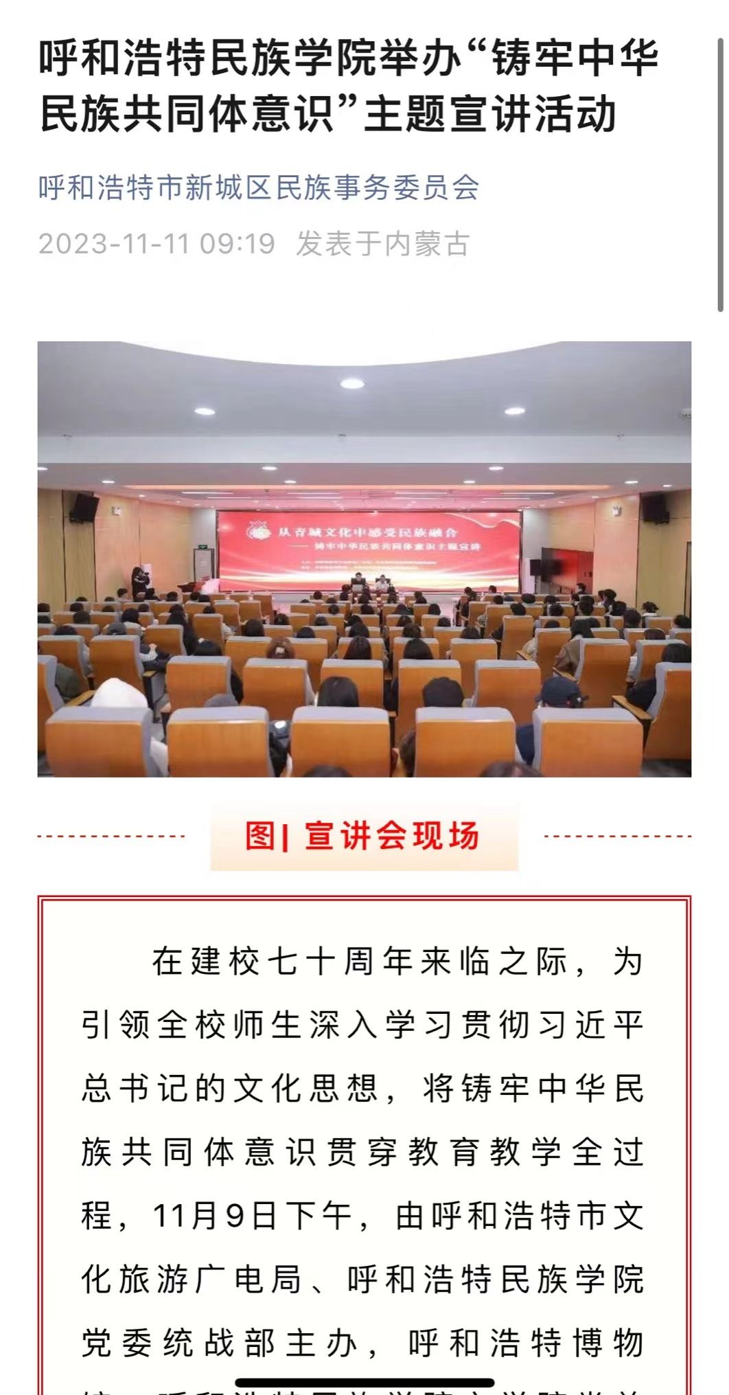 11月9日下午,由呼和浩特市文化旅游广电局、呼和浩特民族学院党委统战部主办,呼和浩特博物馆、呼和浩特民族学院文学院党总支承办的主题宣讲活动在北区图书馆一楼报告厅举办。活动受到社会各界的广泛关注和大力宣传。截至目前,共有中新网、内蒙古新闻网和内蒙古党委统战部官微、呼和浩特博物馆官微、呼和浩特新城区民族事务委员会官微等6家校外媒体对本次活动进行了宣传报道。